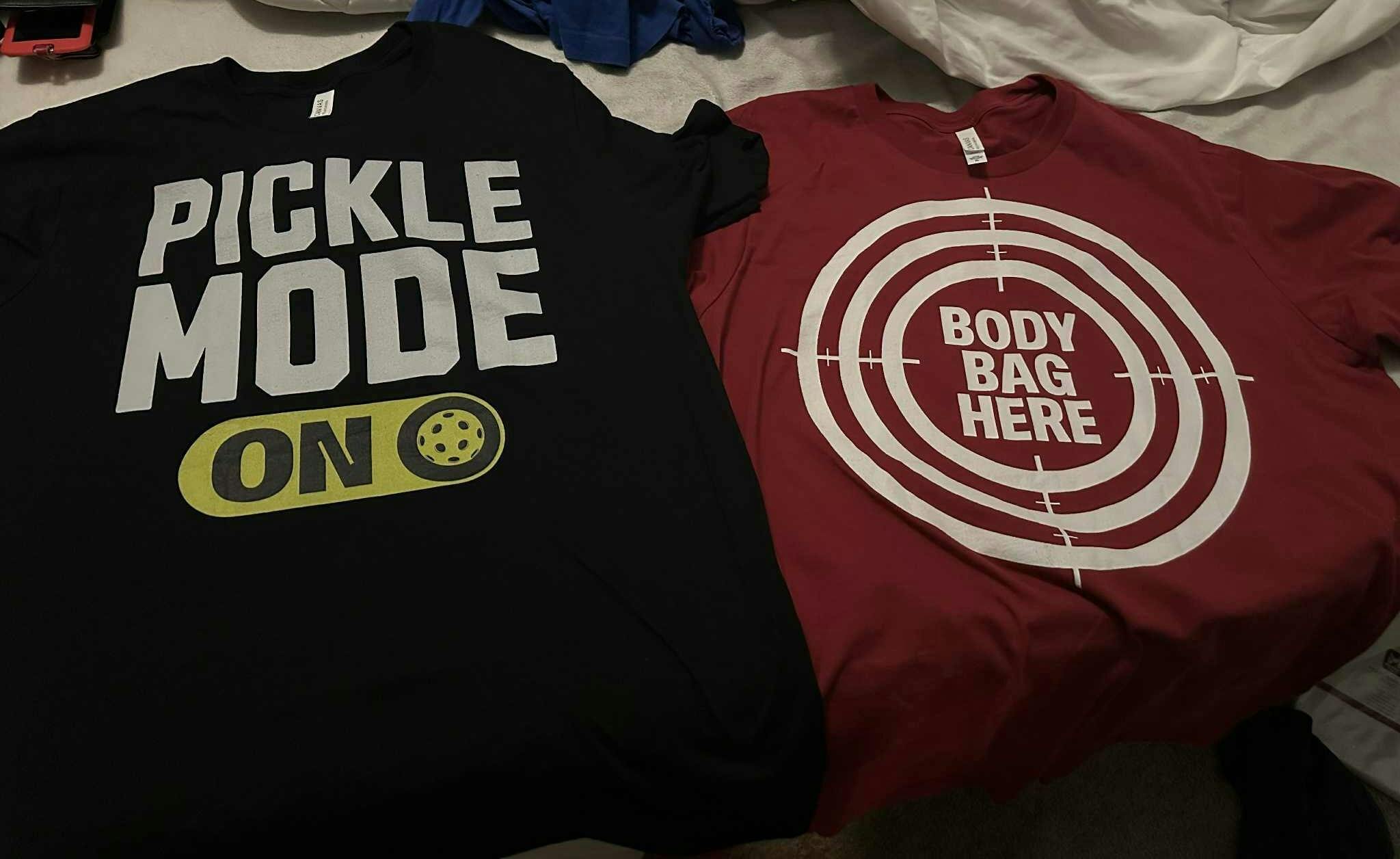 The Heus The shirt fit perfectly on me. Shipping was fast! The shirt design looked even better in person. It was a great conversation starter on/off the court. It definitely encouraged the opponents to ‘body bag’. Most shirts aren’t comfortable to play pickleball in but this shirt texture was soft and flexible. It made playing pickleball very easy and it’s good to know we can always wear this casually.
